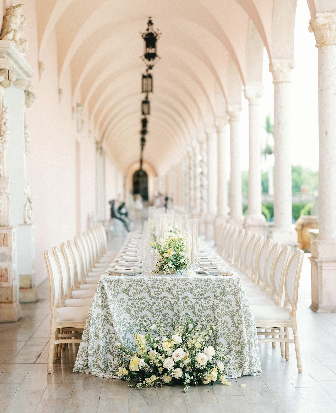 Create a cozy and inviting atmosphere with low tables surrounded by plush pillows or rattan chairs for seating. Layer the tables with textured tablecloth rentals in sandy tones or soft beachy hues, and pair them with terracotta plates to complement the coastal theme. Boho-inspired décor like macramé runners, lanterns, and dried floral arrangements will tie the look together beautifully.